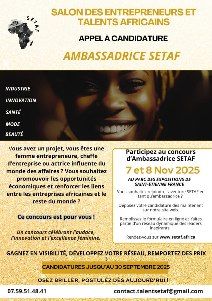Le concours Ambassadrice SETAF Entrepreneuse est une initiative unique dédiée à la reconnaissance et à la valorisation des femmes entrepreneuses africaines. Si vous êtes une femme ambitieuse, dynamique et visionnaire, incarnant l’audace, l’élégance et la réussite, c’est votre chance de briller sur une scène internationale et de devenir un modèle inspirant pour la jeunesse africaine.